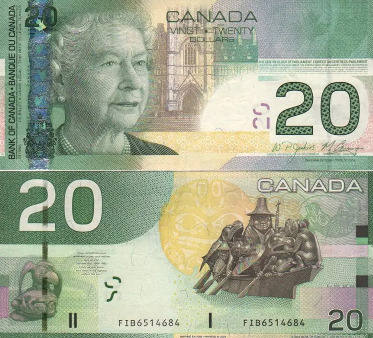 Эта банкнота стала настоящей жемчужиной в мире бонистики, особенно для коллекционеров, увлечённых изображениями Елизаветы II. Канадская двадцатка демонстрирует один из самых элегантных портретов королевы в её зрелом возрасте, который считается одним из лучших. На обратной стороне банкноты мы видим творчество Билла Рейда, посвящённое культуре индейцев хайда. Его произведения стали символом канадского наследия. Современные полимерные банкноты Канады хоть и сохранили изображение королевы, но не смогли повторить тот восторг, который вызвал классический дизайн образца 2004 года.