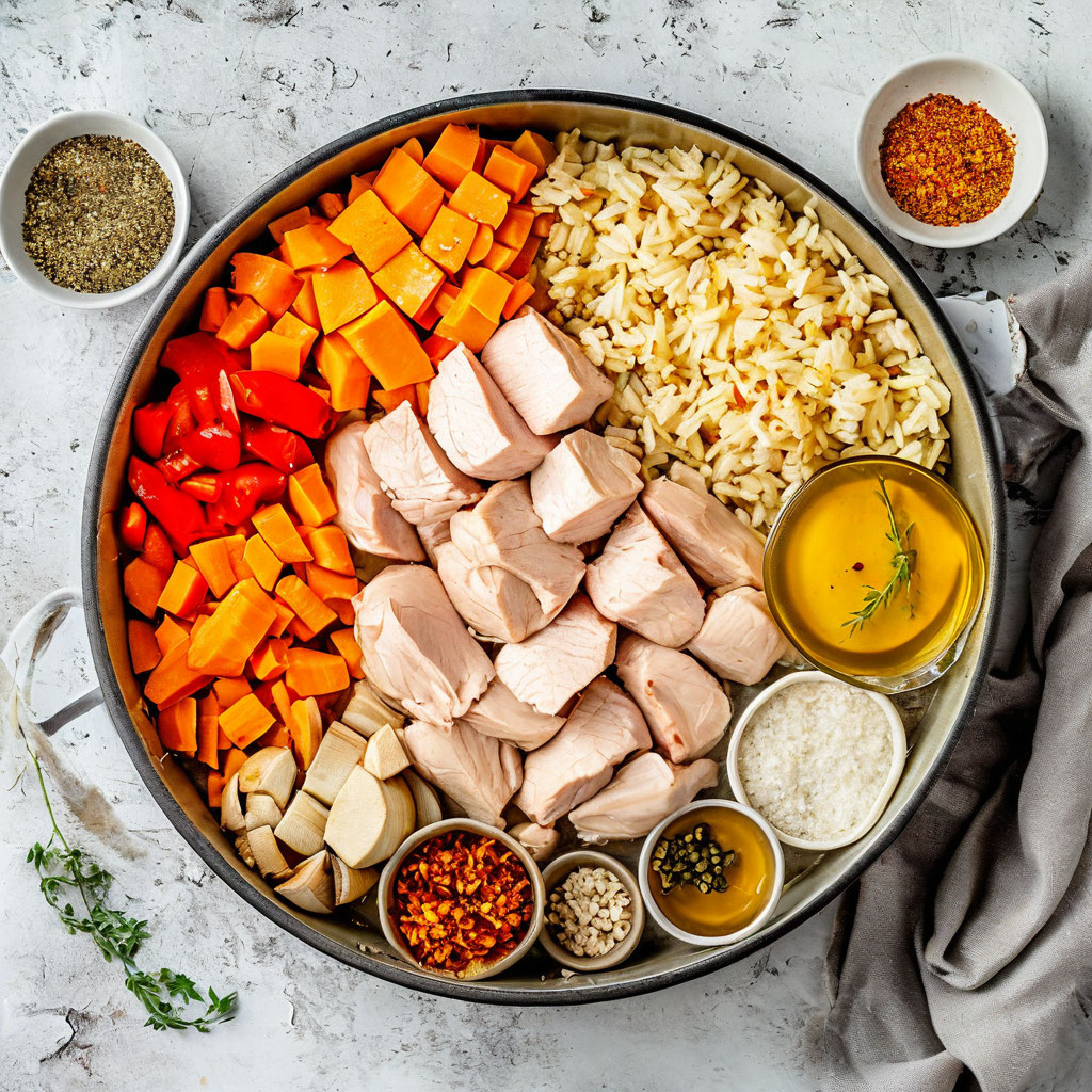 Добро пожаловать на The Culinary Canvas, где мы вдохновляем вас на создание вкусных и простых блюд, которые вы можете приготовить в любое время. Сегодня я хочу поделиться рецептом, который идеально подходит для занятых дней или ленивых вечеров. Это Курица с рисом и овощами — сытное, ароматное и невероятно простое блюдо, которое готовится всего в одной кастрюле. Минимум времени на приготовление и уборку, максимум удовольствия от еды! 😋 Начнем с подготовки: нарежьте куриное филе небольшими кубиками. Овощи — морковь, болгарский перец и лук — измельчите. Чеснок мелко порубите. Эта небольшая подготовка заранее сделает процесс приготовления быстрым и плавным. 😊 Разогрейте оливковое масло в большой кастрюле на среднем огне. Добавьте кусочки курицы и обжаривайте около 5 минут, пока они не приобретут золотистую корочку. Посолите и поперчите по вкусу. Это придаст мясу насыщенный вкус. 😋 Когда курица слегка подрумянится, добавьте в кастрюлю лук, морковь и чеснок. Готовьте, помешивая, около 3–4