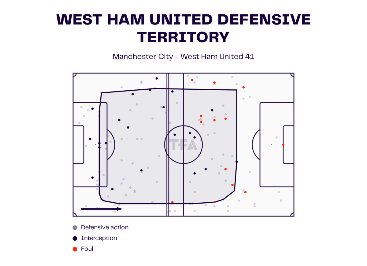 «Вест Хэм Юнайтед» подошли к матчу с горожанами с четким оборонительным планом. Осознавая способность к доминированию «Манчестер Сити» во владении мячом и их мощную атакующую угрозу, они выбрали компактную оборонительную структуру, призванную ограничить пространство.