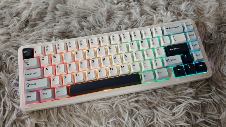 EPOMAKER x AULA F65 – компактная механическая клавиатура с продуманной пятислойной конструкцией, трехрежимным подключением и сочным звучанием. Рассказываем в обзоре, на что способна эта модель. EPOMAKER x AULA F65 поставляется в негабаритной коробке, оформленной в черном и зеленом цветах. На лицевой ее стороне нарисован забавный маскот, а на обратной части разместилось схематичное изображение модели и приведена информация технического характера. Клавиатура внутри упакована в защитный чехол и прикрыта пластиковой накладкой, зажата ограничителями из картона во избежание повреждения при транспортировке. В коробке также лежат кабель USB-A — USB-C, съемник для переключателей и кейкапов, пара запасных свитчей и руководство пользователя — стандартный, в общем-то комплект. Модель получила форм-фактор 65%, без нампада и функционального ряда, со смещением стрелок и некоторых вспомогательных клавиш влево. Получилась очень компактная компоновка, благодаря которой EPOMAKER x AULA F65 занимает совс
