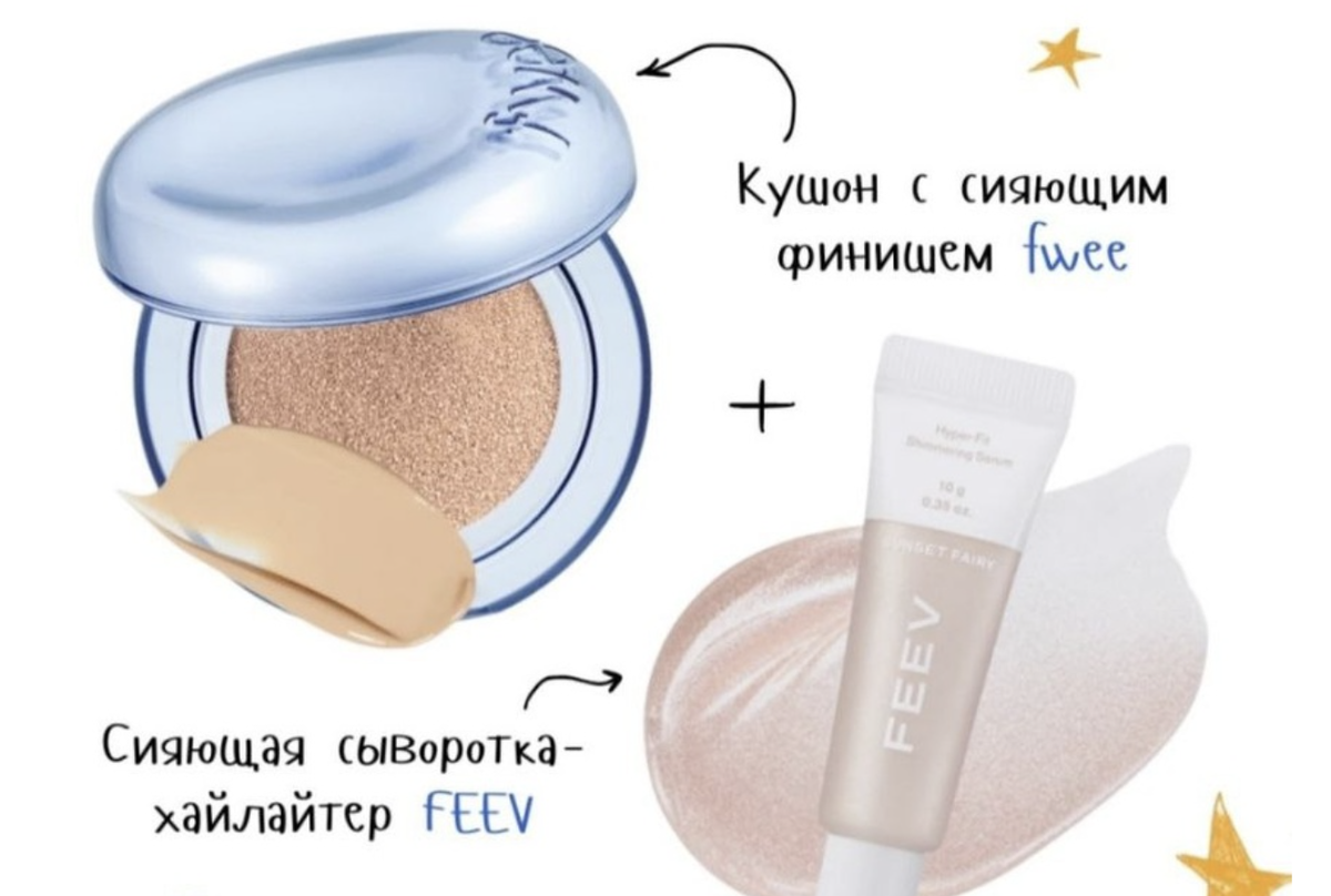 Нанесите сияющую сыворотку-хайлайтер (например, FEEV) на лицо перед тональными средствами. Она не только придаст мерцающий эффект, но и увлажнит кожу благодаря ухаживающим компонентам. 🔹 Финишный штрих