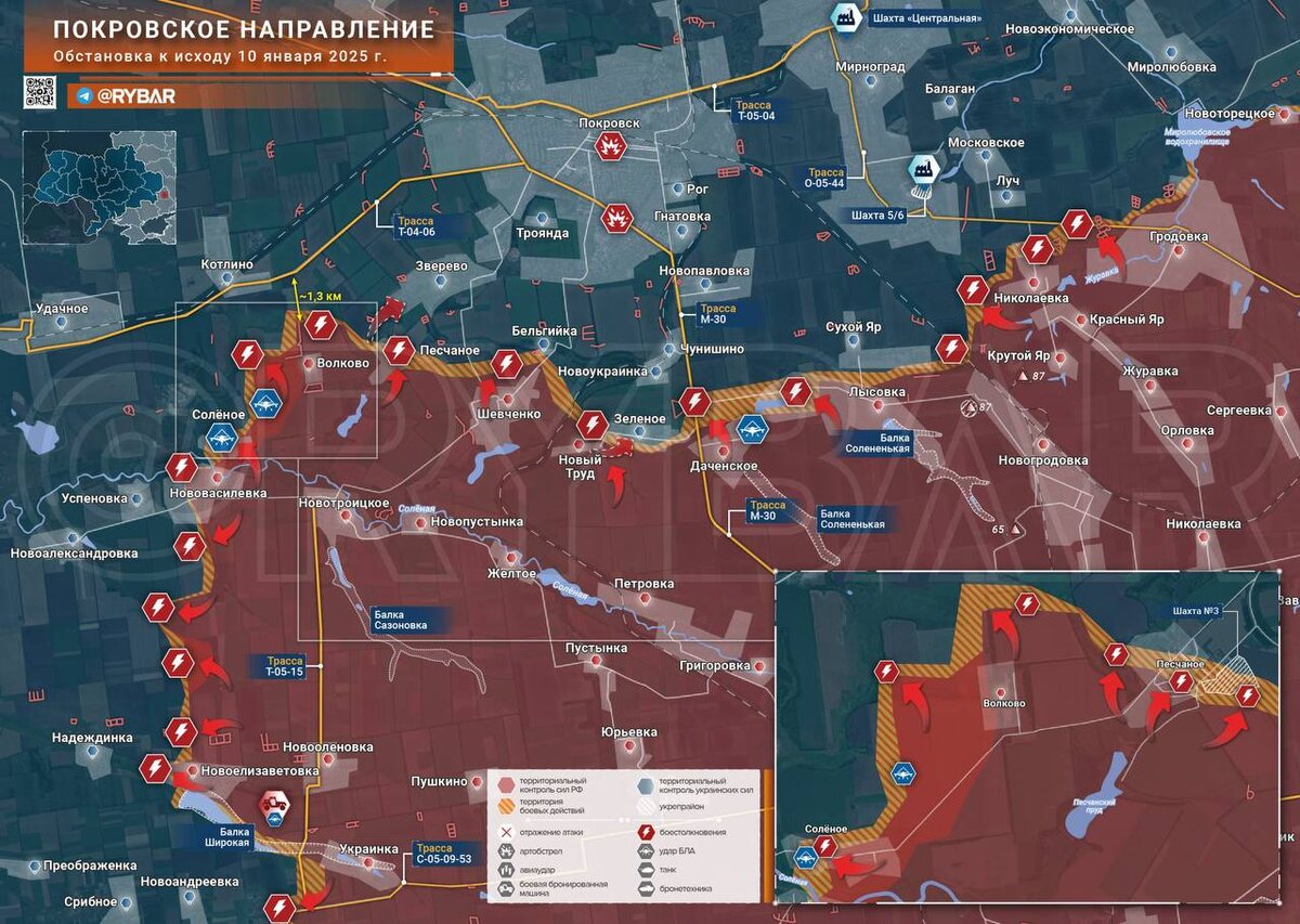🇷🇺⚔️🇺🇦Краткая сводка по итогам спецоперации на вечер 10 января 2025г. Российские войска нанесли удары по целям в приграничных и тыловых областях т.н. Украины. Под огонь, в числе прочих, попали Черкассы и Киев. В то же время ВСУ произвели пуск БЛА по центральным и южным регионам России. В Курской области российские войска продолжают атаки на позиции ВСУ в Суджанском районе: наиболее активные бои разворачиваются в окрестностях Малой Локни, Махновки и к юго-западу от Русского Поречного. На Александро-Калиновском направлении бойцы ВС РФ расширили зону контроля в границах Дзержинска, а к западу от города освободили Леонидовку и окрестности. Со стороны Новгородского российские подразделения продвинулись к Сухой Балке. На Покровском направлении штурмовые группы ВС РФ заняли несколько лесополос на рубеже Волково — Соленое и большую часть последнего. А в Запорожской области подтвердилась утрата ВС РФ как минимум части юга Каменского: поводом к этом