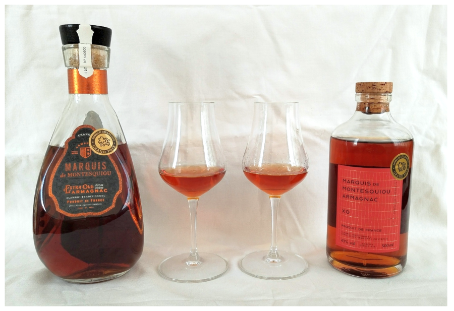 «Marquis de Montesquiou Extra Old Armagnac» (2017): яркий, выраженно маслянистый, совершенно не спиртуозный, нейтрально сухой (без намека на сладость), не вяжущий, в основе насыщенный смолисто-цитрусово-бальзамический (босвеллия, древесина светлого сухого дуба и кипариса, свежая померанцевая и бергамотовая корки, бензойный стиракс), тут же оттеняемый нотами пряностей (кардамон, имбирь, белый перец, ваниль, корица), сухих белых цветов и ореховой скорлупы, с тонкими тонами косточковых сухофруктов (урюк, сухой чернослив) и горького шоколада. Строгие пряно-смолистые и десертные бальзамически-ванильные ноты длительно и красиво конкурируют. Очень здорово! (4).