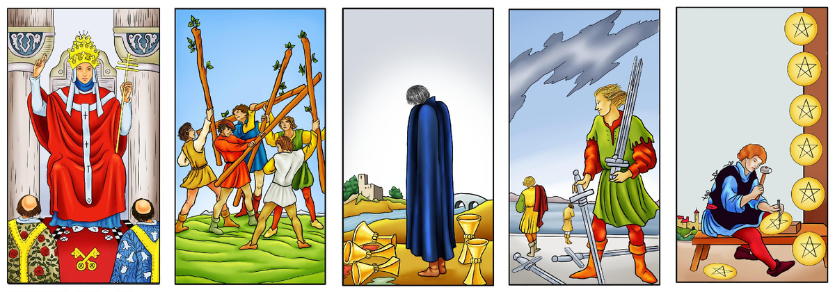 Так что пятерки — это проблемы в жизни человека, которые заставляют двигаться вперед, а Жрец направляет и подсказывает, как использовать эти испытания для роста.