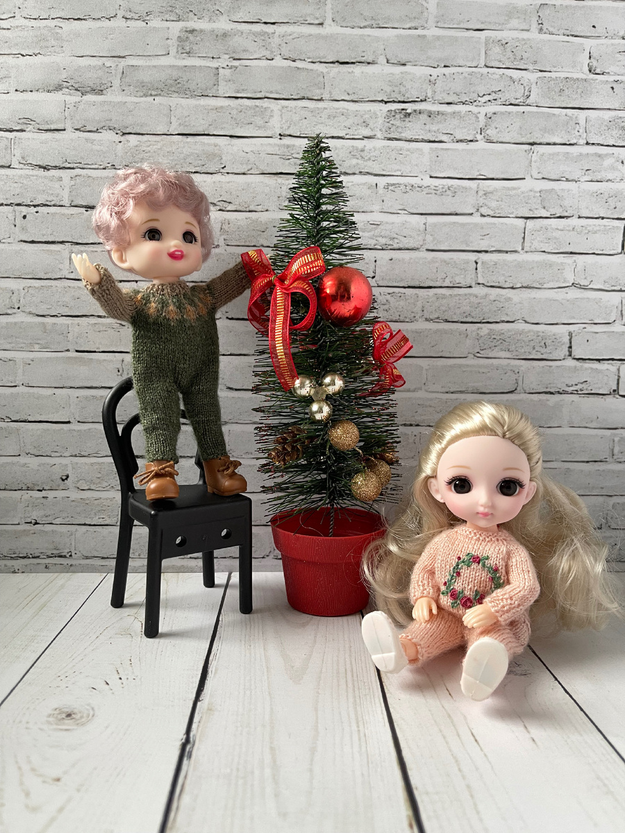 Все кто мог уже сделали фото кукол у елочек. Кто то уже даже успел елку разобрать. А у нас елка только появилась. Ну раз появилось нужно сделать фото. У меня как раз связалось два комбинизончика на Баболи. Макс и Оливия решили сфотографироваться около елочки. Ну вот собственно и все фотографии😅 На больше меня не хватило. Оливия постоянно падала на спину. Ее волосы перевешивают (даже в сидячем положении). А Макс постоянно заваливался в разные стороны из за слабых шарниров в стопах. Так что фотосессия вышла короткой. Кстати за вышивку на комбезике Оливии мне подарили схему вышивания сердечка. Так что следующий комбинезончик будет с вышитым сердечком ❤️. И еще будет МК по вязанию. Не пропустите.