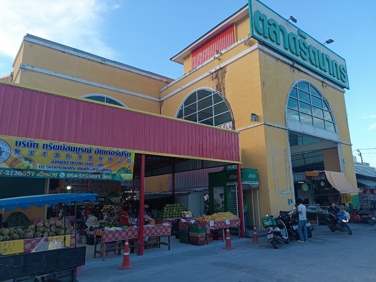 Трижды забрасывал Старик невод в море чтобы поймать Золотую рыбку. Трижды мы посещали рынок Ратанакорн, чтобы уловить его дух. Как обещали — делимся только объективной информацией. Располагается он на ул. Теппрасит напротив кондо Supalay и рядом с шоу трансвеститов Колизей. Добраться к нему можно, как на такси Bolt, Grab (хороший совет😁?), так и на темно-синем сонгтэо (идёт с центра до Джомтьена и назад) по ул. Таппрайя до пересечения с ул. Теппрасит за 10 бат с человека. Далее по Тепрасситу можно как «барин на двуколке», вернее опять на сонгтэо («две скамейки») за 10 бат (ходит только по Теппраситу, соединяя Таппрайю с ул. Сукхумвит), проехать 750 метров. Но ходит реже — раз в 15-20 минут. Поэтому, эти же метры можно использовать как кардионагрузку, тем более, что это полезно, да и ходить за покупками нужно по утрам. А по пути проходишь мимо магазинчика, где продают только дуриан, машин с которых продают мини бананы (эти цены ниже, чем на рынке) и макашниц с шашлычками для местных.