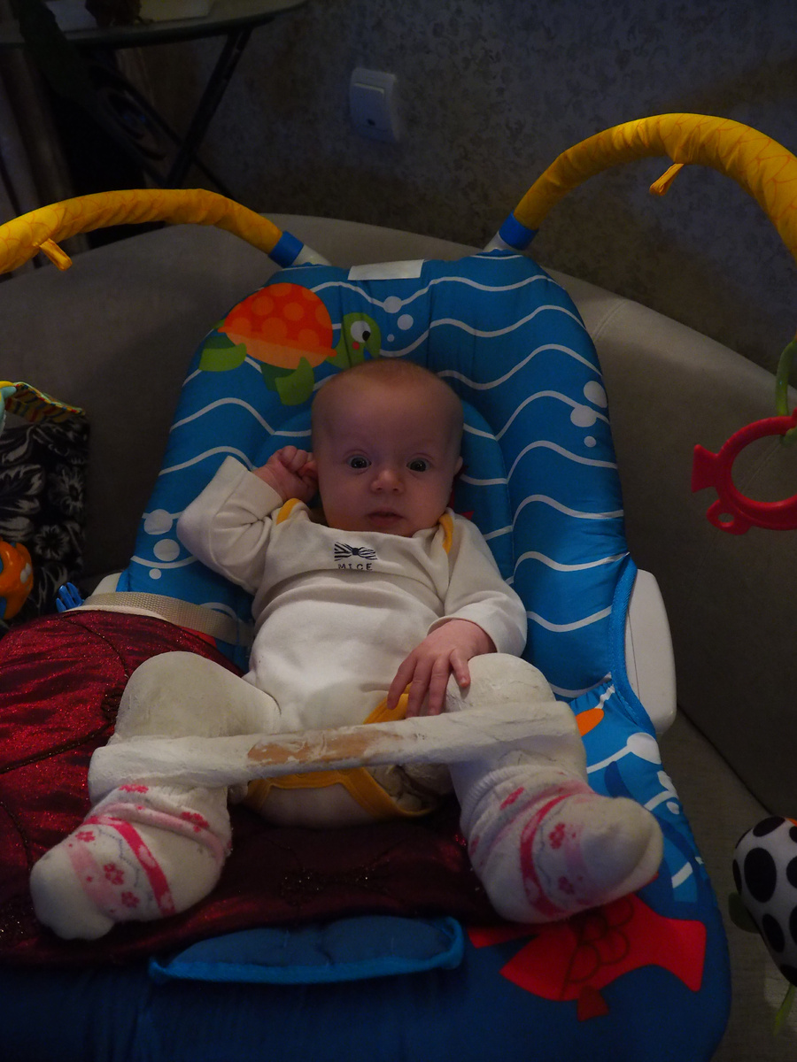 Затем мы были отправлены в ГИПСОВУЮ для замены палки. Мед. сестра СПИЛИЛА старую палку, которая была также загипсована (да-да! Реально пилой спиливала!), и Ваське установили нашу НОВУЮ палку (на 29см). Через 20 минут после установки надо было подойти к врачу. Когда время истекло, Васька сильно кричала, и врач решил, что сильно растянули и отправил нас в гипсовую, чтобы уменьшить «растяжку». Использовали ту же палку, просто «растяжение» ножек сделали поменьше. А палка малец выпирала по бокам. Хотя мне кажется, что доча просто уже хотела спать… Но рисковать не стали, так как наступали новогодние праздники.