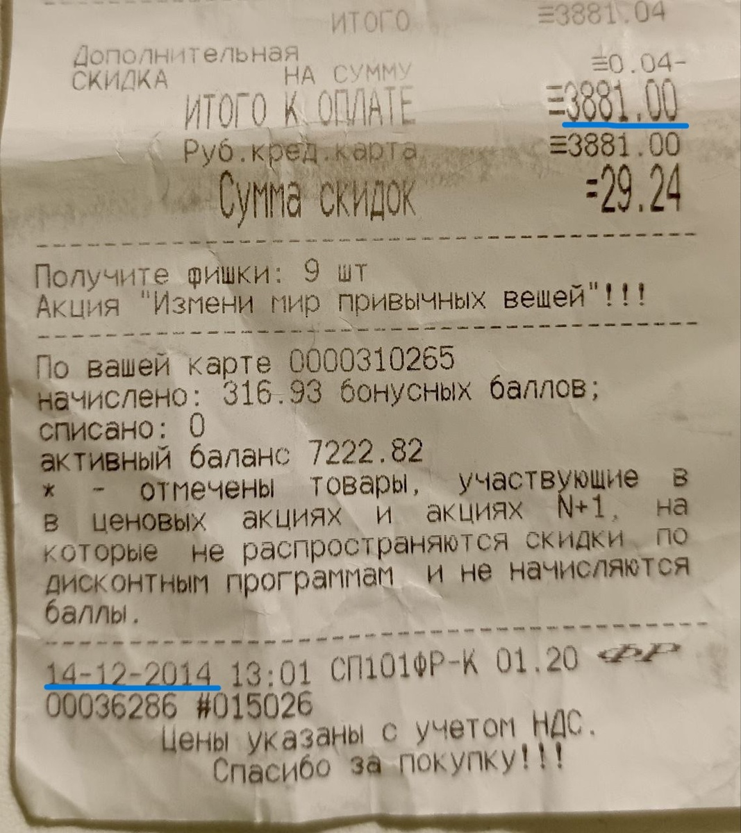 ❤ Telegram Как-то, приехав домой к родителям и покопавшись в старых пакетах, я обнаружила в одном из них чек с покупками продуктов за 2014 год. Посмотрев на цены, захотелось плакать. К стати, пакет был из-под обуви Centro. Кто вспомнил и прослезился? Вот я так точно. Были же времена... Моя молодость проходила как раз в ту пору, мне было всего-то 21 год, сколько воспоминаний, сколько всего изменилось! Вот таким образом и попал мне в руки чек за 2014 год. Готовы прослезиться? Тогда давайте посмотрим на товары, сколько они стоили тогда и сколько стоят сейчас. Чек принадлежал гипермаркету "Наш", на месте которого затем открылась "Лента". Цены я так же буду стараться искать из "Ленты". Первым пунктом идут яблоки, без пояснения какие. Самые дешевые в "Ле