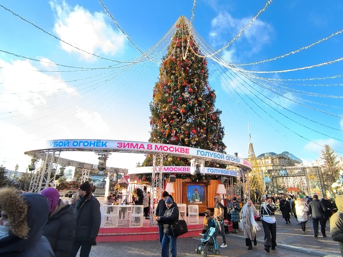Друзья, нынешняя новогодняя ярмарка на Манежной площади просто поражает своей уникальностью в дизайне. Тема оформления ярмарки 2024 -- "Голубой огонёк". Это воспоминания о тех временах, когда для многих деревья были большими, а для молодёжи -- способ узнать о тех временах из деталей дизайна ярмарочных шале, ёлок и инсталляций.