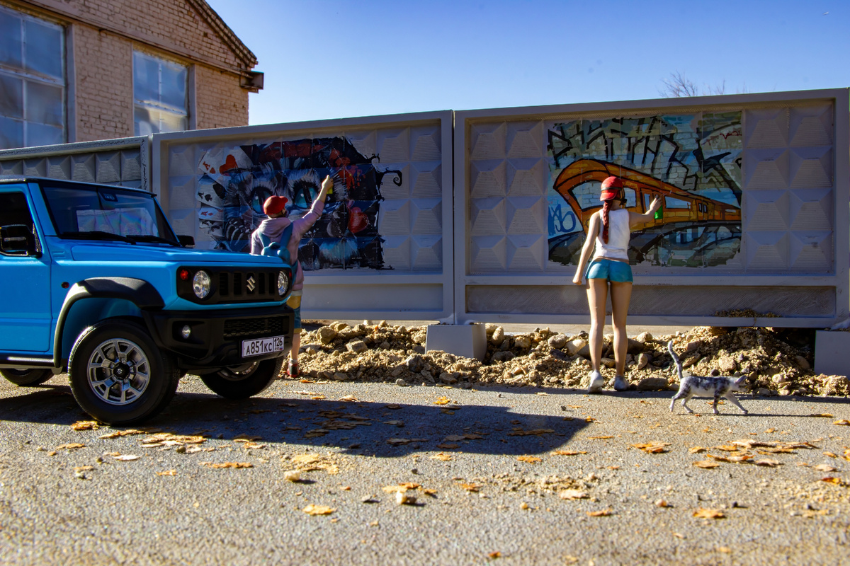 Всем привет, друзья! Сегодня удалось сделать новый фотопроект. Назову его "Художники-хулиганы". Подготовку к нему начал еще в прошлом году, больше 4 месяцев назад. Много чего пришлось сделать, что-то самому, что-то при помощи коллег, отдельные слова благодарности: Это был мой первый опыт по нанесению таких больших декалей. Хочу сказать, что декали очень хорошего качества, ничего не порвалось и все село очень хорошо. Для смягчения и приварки использовал вот этот набор: Фигурки от Амформы: Во время данный совет на покупку модели Jimny Сергей Савкин