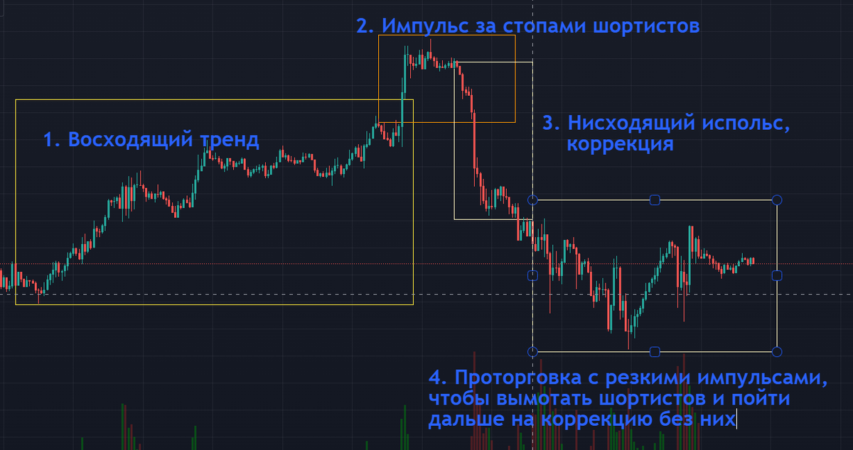Пример манипуляции ММ 1. Идёт восходящее движение, на движение заходят трейдеры в лонг 2. Пришло время выпотрошить лонгистов, но мешают шортисты, что делать? Правильно, резкий импульс за стопами, для закрытия позиций шортистов 3. Теперь можно спокойно падать вниз и создавать убытки для лонгистов 4. Как только новые шортисты сели не хвост, началась проторговка с резкими импульсами и ложными пробоями, чтобы всех вымотать и создать неопределённость. Только разгадывая идеи ММ можно зарабатывать. ММ торгует всегда против большинства.