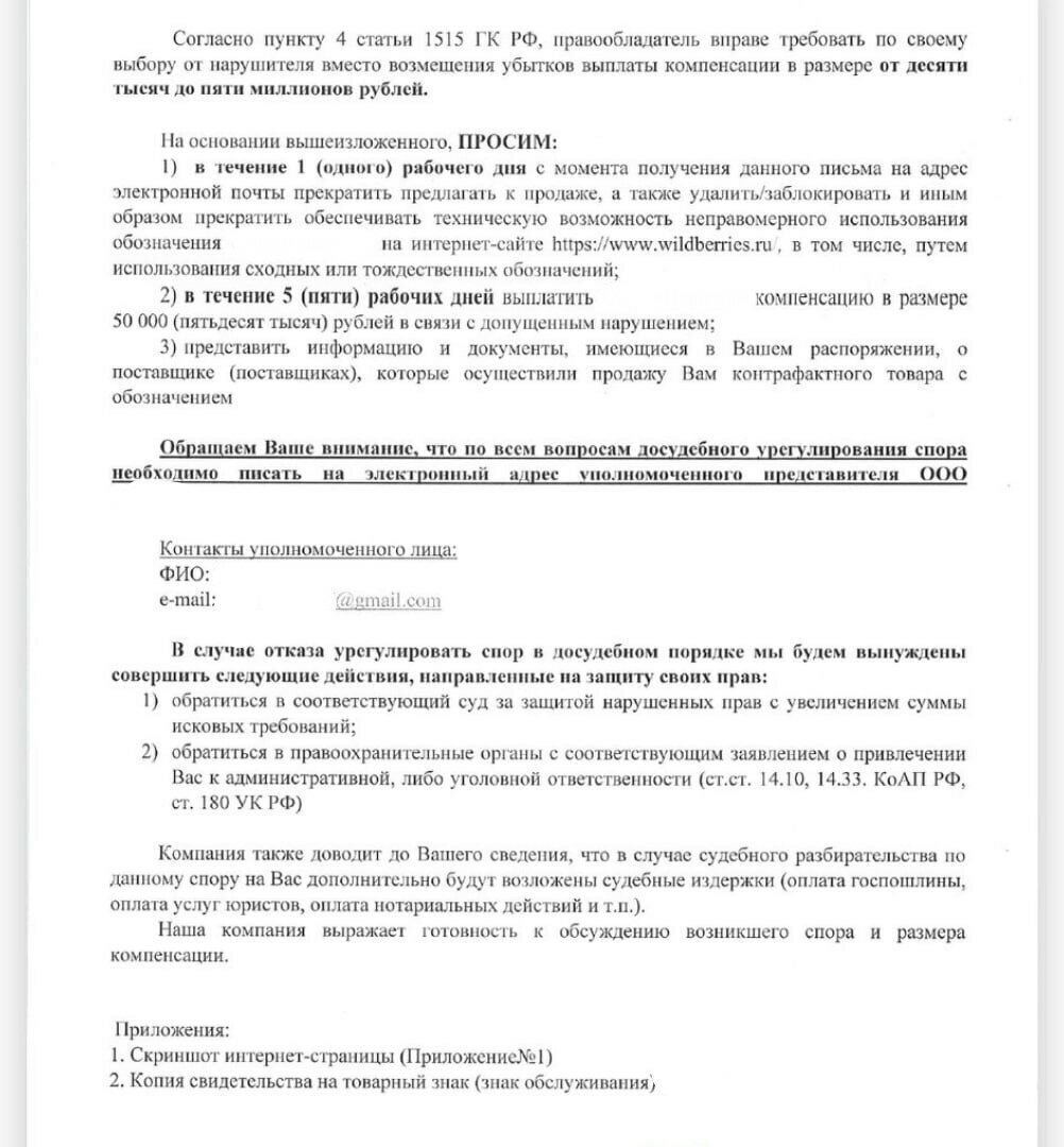 Правообладатель также может направить вами и "Обращение правообладателя", если нарушение было совершено в маркетплейсеWildberries (Вайлдберриз). В данном случае, вы можете почитать мою статью, которая рассматривает эти случаи: https://dzen.ru/a/ZAoxZtThNyFKEewi