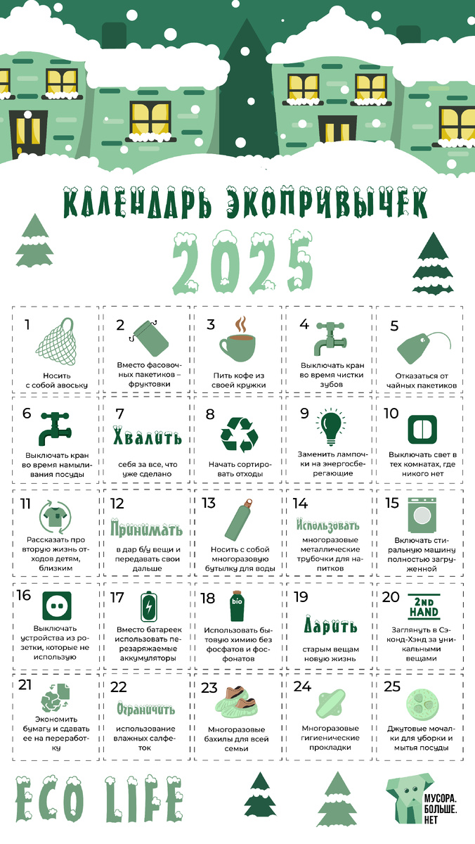 Создали для вас красочный Адвент календарь экопривычек, который, надеемся, будет мотивировать вас, вдохновлять приобрести новые экопривычки в 2025 году. Распечатываем, весим на видное место в доме, на работе и вперед на встречу к экологичному образу жизни! :) Делитесь, какая экопривычка из календаря уже есть в вашей жизни?