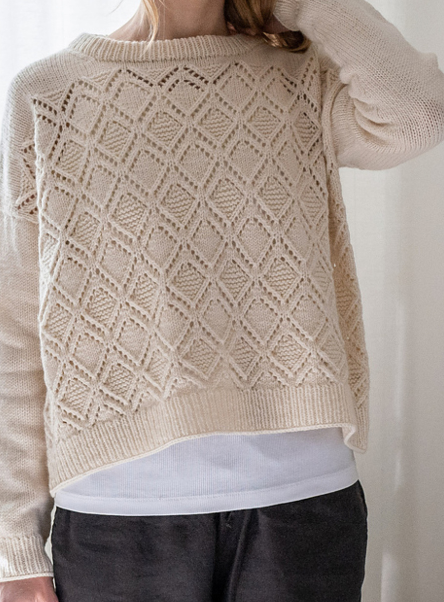 Молочный джемпер с узорами из ромбов. Узор связан на передней части изделия, рукава лицевой гладью. Джемпер солнечного цвета связан из микса разных узоров. Мятный джемпер связан несложным узором, смотрится великолепно. Нежно-розовый джемпер сочетает в себе узоры «сетка» и араны. Лаконичный пуловер с несложным узором Молочный пуловер с узором «Ромбы»