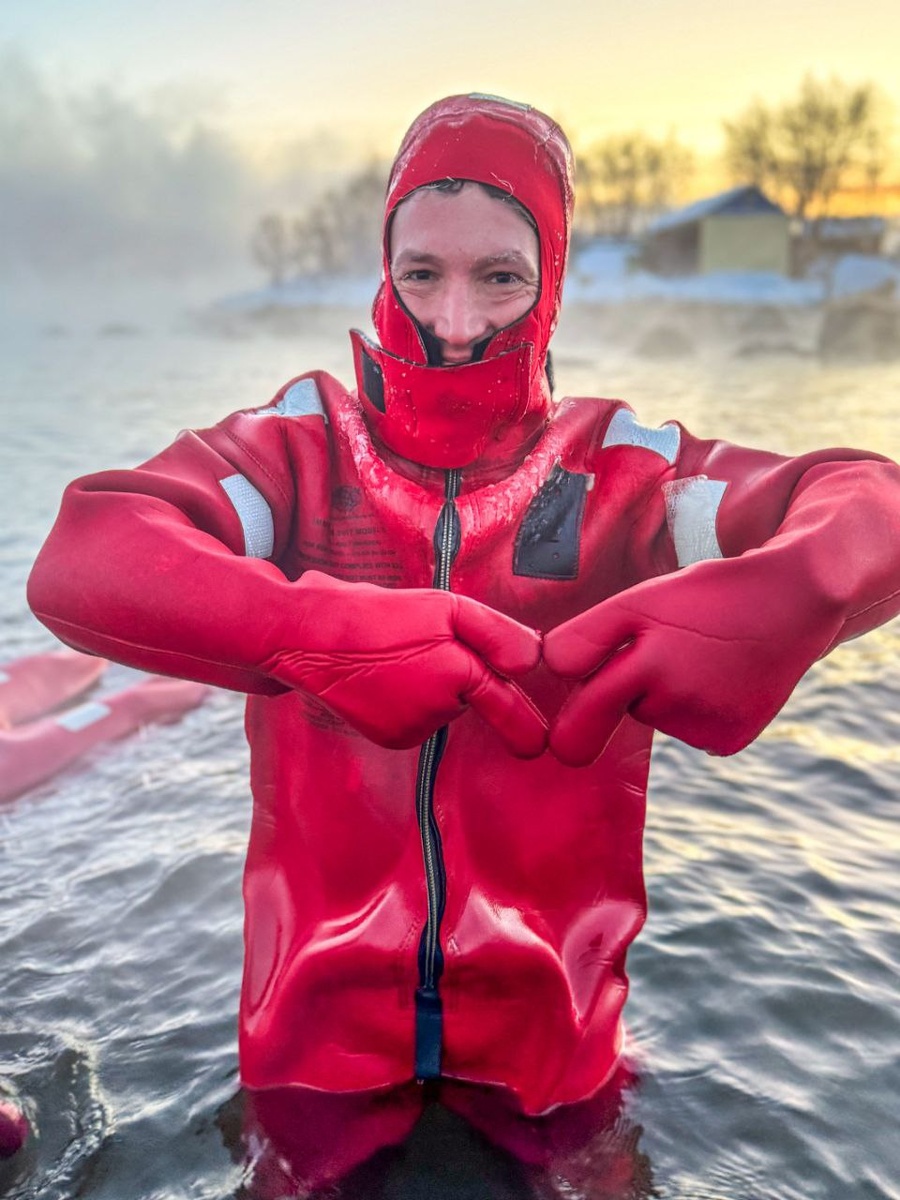 Можно долго говорить и строить теорий о жизни, а в это время сама жизнь она вот прямо сейчас и происходит. Для меня обязательны движение и активность. Посему, я решил раскрасить свою короткую поездку в Мурманск какой-нибудь интересной активностью. Несколько лет наблюдал в Териберке как люди в сухих гидриках купались в Баренцевом море. И вот решил организовать сие развлечение родом из Заполярья во время своей поездки. Собрал 11 мурманских друзей и устроили заплыв в тёплых водах Кольского залива. Ну как тёплых, вода +3°, а на улице в тот день было ниже -20°. Костюмы для айсфлоатинга безразмерные, надеваются на одежду - термобелье и второй слой, без обуви и курток. В нём не холодно. Это как гидрокостюм толщиной 7 мм, только огромный и сухой - воду не пропускает. Костюм обладает положительной плавучестью и словно выталкивает из воды, за счет чего создается эффект невесомости. Интересные ощущения. На спине - как на перинке лежишь, паришь, медитируешь. Вертикально тоже забавно - как поплавок