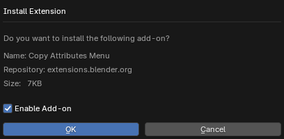 Начиная с версии Blender 4.2 многие полезные расширения (как, например, Copy attributes menu) переехали на https://extensions.blender.org и исчезли из стандартной поставки. Чтобы поставить расширение (add-on) с сайта https://extensions.blender.org нужно Всё. Расширение будет установлено в "%APPDATA%/Blender Foundation/Blender/4.3/extensions/blender_org". Более простой способ установки расширения - через "Get Extensions" в настройках Blender. Тут совсем всё просто: ищем расширение и ставим его ("Allow Online Access" галка должна быть установлена). Раздел "Get Extensions" также позволяет удалить уже установленные расширения через кнопку "Uninstall" в контекстном меню расширения. Не думаю, что это рекомендованный способ, но работает. Экспериментально установлено, что достаточно удалить папку расширения из "%APPDATA%/Blender Foundation/Blender/4.3/extensions/blender_org", чтобы оно больше не использовалось. В контекстном меню установленного расширения есть кнопку "Uninstall", нажав на кото