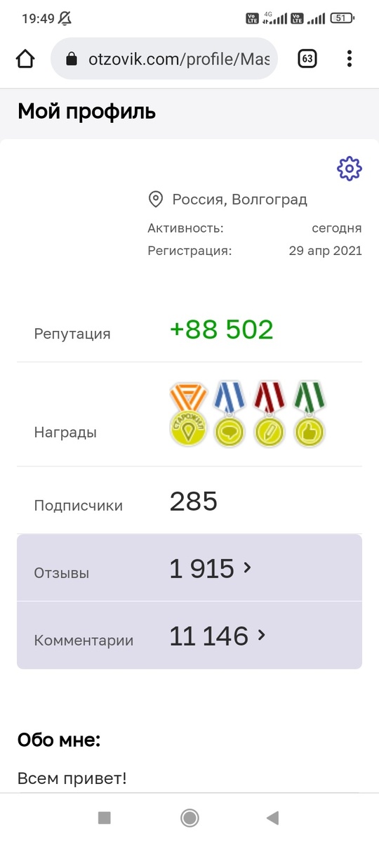 Я не топовый автор сайта и не всегда за период с момента регистрации была активна ежедневно, тем не менее уже имею репутацию +88 502 (столько "лайков" получила за написанные отзывы), ряд наград и 285 подписчиков (подписаться на этом сайте можно только на 200 авторов). Написала 1915 отзывов и оставила более 11 тысяч комментариев. Всё это отражено в разделе "Мой профиль". Здесь же можно разместить интересную информацию о себе.