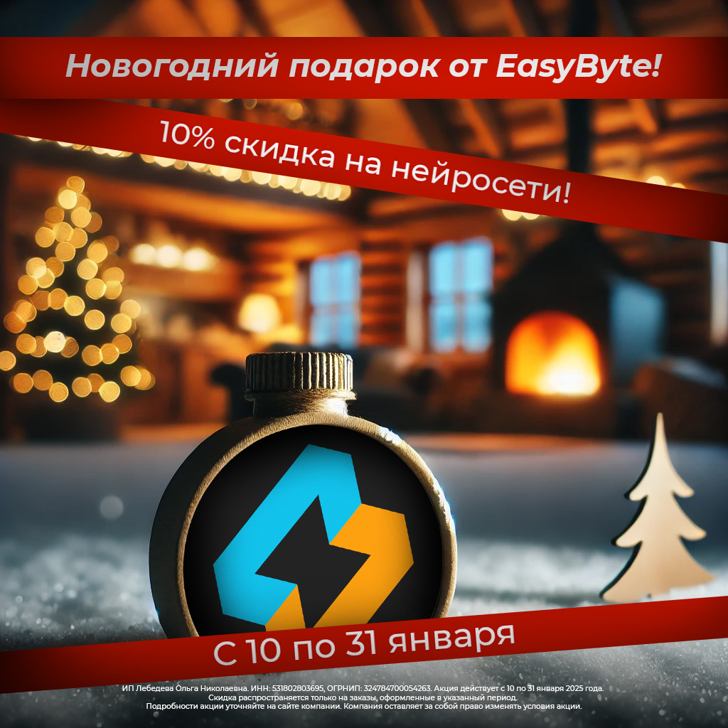 Мы в EasyByte верим, что нейросети — это не просто технология, а мощный инструмент для вашего бизнеса. И чтобы сделать новый год ещё более продуктивным, мы дарим 10% скидку на разработку и внедрение нейросетевых решений! 🔥 Акция действует с 10 по 31 января 2025 года. Успейте воспользоваться этим предложением, чтобы начать год с инновационного старта. 📌 Подробнее о скидке и условиях акции читайте на нашем сайте https://easy-byte.ru/ Давайте сделаем ваш бизнес лучше! 🚀