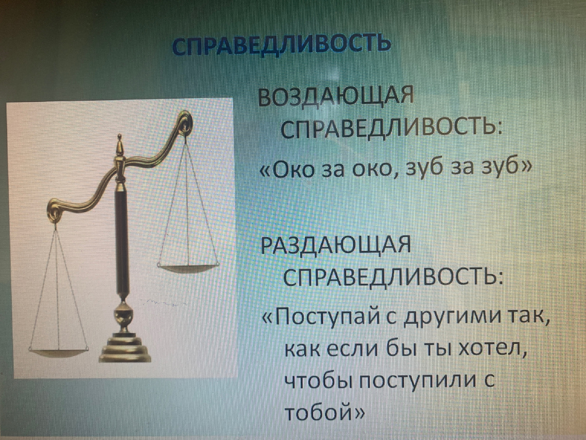 Следовательно для каждого человека справедливость прежде всего означает возможность обеспечение возможностей для его самореализации, обеспечения необходимых и достаточных условий для возможности удовлетворения его личных потребностей для достойной жизни, для самоуважения и уверенности в благополучном будущем. то есть необходимость признания окружающими нас людьми, родными и близкими. обществом и государством ценности нашего бытия. нашей жизни нашей личности.