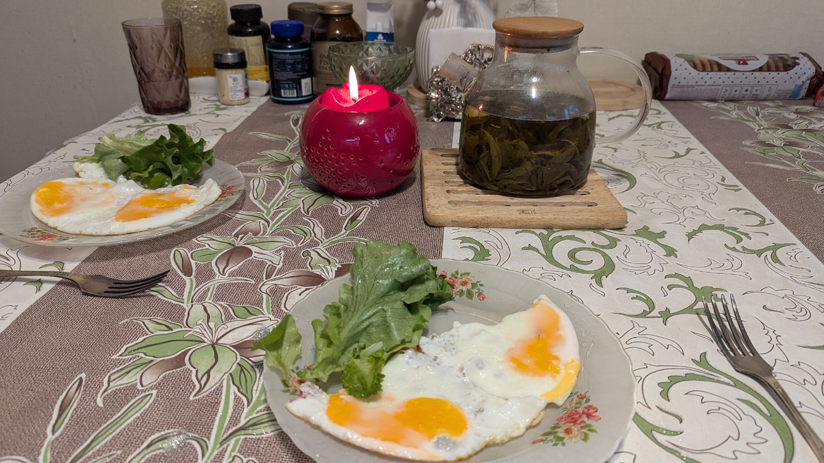 09-40. Проснулась от того, что по окну барабанит дождь. Как хорошо, суббота и никуда не надо спешить. Всё-таки расслабились мы за праздники и эти прошедшие два рабочих дня лично мне дались ой как тяжело. А ещё я человек, который любит солнышко, может потому, что родилась весной. А у нас уже наверное третий день барабанит дождь и от этого хочется просто закутаться в плед, взять хорошую книжку в руки, заварить любимый чай. А не вот это всё- бежать куда-то и что-то делать. Но сегодня наконец можно замедлиться. Посмотрим, получится ли. 10-00. Идём гулять с Симбой. Кругом лужи и какие-то сумерки. Сделали небольшой круг по нашему району и домой. На обратном пути зашли в магазин купить зелёный чай с жасмином. Ни с того, ни с сего захотелось мне такой чай, причем срочно. У Вас так бывает? Что "загорится" в одном месте и все тут. У меня честно скажу бывает и не редко. 10-30. Завтракаем. Яичница с зеленью. И конечно ароматный зелёный чай с жасмином. Пью маленькими глотками, наслаждаюсь.