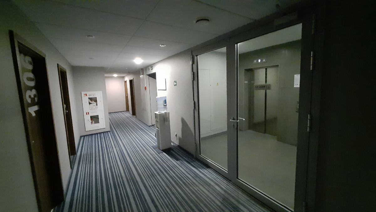 Тринадцатый этаж и лифтовый холл. И ровно напротив двери нашего номера - кулер, так как чайника предусмотрено не было.