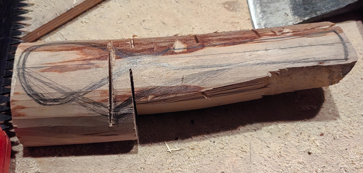 Изготавливаю ложку из половинки ствола черемухи. Прорисоваваю будущие очертания ложки в двух плоскостях, делаю надпилы и понемногу начинаю убирать лишний объём. Обрубил держало, оставил прилично запаса, для того чтобы случайно не испортить заготовку. Приличным топориком ещё не обзавелся, а древесина довольно твёрдая. Полешко хранилось дома и изрядно высохло. Также немного убрал с изгиба. В дальнейшем окончательный контур изгиба сформировал при помощи полукруглой стамески. На данном этапе вырезаю внутреннюю часть черпала, тк возможно удобно зажать заготовку и уверенно поработать клюкарзой и ложкорезом. После выборки я ещё немного поработал топориком и убрал лишнее с тыльной стороны. Далее работаю с обратной стороной черпала. При некоторых резах понял, что можно попасть в радиальные плоскости на которых будут хорошо видны сердцевинные лучи. Срезал данные плоскости симметрично, примерно до середины черпала. Между ними добавил ещё 3 плоскости. Все плоскости сходятся в перемычке. По