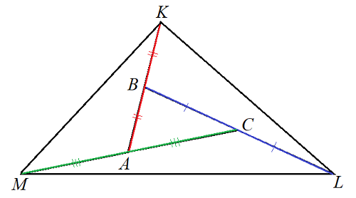 СА = АМ. Найдите площадь треугольника KLM. На большой вопрос пришёл большой ответ (извините, что мелко, мы его читать не будем. Там есть выражение площади треугольника через две стороны и синус угла между ними). Источник. https://www.bolshoyvopros.ru/questions/4150943-ploschad-δavs-ravna-1-sm-ris-avvk-vssl-saam-kak-najti-ploschad-δklm.html Давайте рассмотрим «детское» решение поставленной задачи. Построим отрезки AL, BM и CK. Мы получили 6 треугольников, в каждом из которых применим свойство медианы: она делит треугольник на два р
