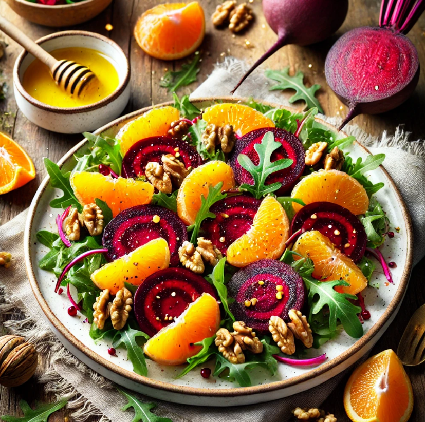 - Соберите салат: На тарелку выложите слой рукколы или шпината, затем добавьте свеклу, апельсин и посыпьте орехами.