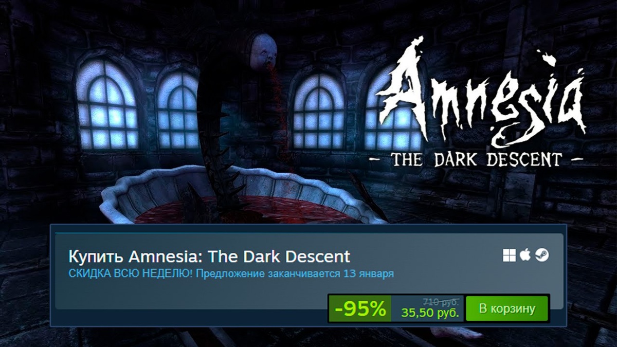 Забираем по цене пачки кириешек: в Steam стартовала огромная скидка в -95% на Amnesia: The Dark Descent. За 36 рублей вы получите хоррор на выживание, где вам предстоит сыграть за Даниеля, который проснулся в мрачном замке и ничего не помнит. Забираем до 13 января здесь.
