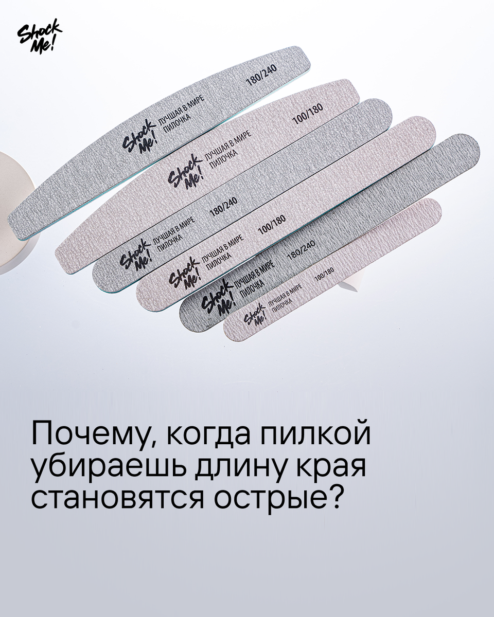 Когда вы подпиливаете длину ногтей пилкой или убираете её фрезой, край ногтя становится более острым из-за способа, которым материал срезается или стирается. Чтобы избежать слишком острого края, после удаления длины рекомендуется слегка закруглить или сгладить края ногтя с помощью пилки с более мелким абразивом (например, 180-240 грит), чтобы придать им более мягкую форму. Это поможет сделать край ногтя менее острым и комфортным. Всем идеального маникюра! Пилочки можно найти на WB по поиску: пилки шок ми. А если у вас есть вопросы, то смело их задавайте в комментариях. Если же мы не ответили на ваш вопрос до сих пор, то просто продублируйте его тут ❤️ YouTube https://www.youtube.com/@ShockMeNails