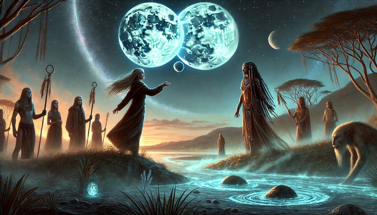 На далёкой планете Кавиро, освещённой двумя лунами, жили два народа: Тенуи и Ларии. Их земли были разделены рекой Ама, а мировоззрения — временем, проведённым под разным лунным светом. Тенуи видели в больших фазах луны символ возрождения и перемен, поэтому их города пестрели лунными орнаментами и светящимися шарами. Ларии же почитали малую луну за её постоянство и спокойствие. Их деревни были тихими, а дома украшали сдержанные узоры, отражающие волны реки. Главной героиней была Сейли, молодая наставница Тенуи, которая изучала историю и мудрость своего народа. Она жила на окраине города, где каждую ночь слушала шёпот большого лунного света, записывая в свитки его отражения в воде. Наступило редкое время — когда обе луны сходились на небе почти вплотную друг к другу, создавая эффект двойного сияния. Предки Тенуи и Лариев называли это «Вратами Двух Лун», временем, когда магия и реальность смешиваются. Сейли узнала из древних свитков, что в это время река Ама меняет своё течение и может за