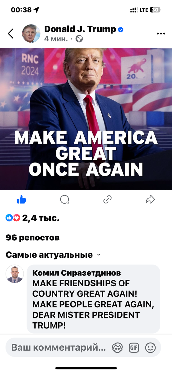 На слова Президента Соединённых Штатов Америки Дональда Трампа, где он часто пишет: - Давайте сделаем Америку снова великой, в комментариях я написал ему: -Мистер Президент Трамп! Давайте лучше сделаем дружбу между странами великой снова, и давайте сделаем снова Человека и Людей великими, а не будем устраивать гонки! Нельзя! 🚫 Так ведь, друзья? Зачем нам гонки между странами, если можно жить и развиваться духовно и материально, и любить друг друга без этих гонок, вирусов и войн! - MAKE FRIENDSHIPS OF COUNTRY GREAT AGAIN! MAKE PEOPLE GREAT AGAIN, DEAR MISTER PRESIDENT TRUMP! Эх, кешелэр, кешелэр! #КомилСиразетдинов #Мир #ДональдТрамп
