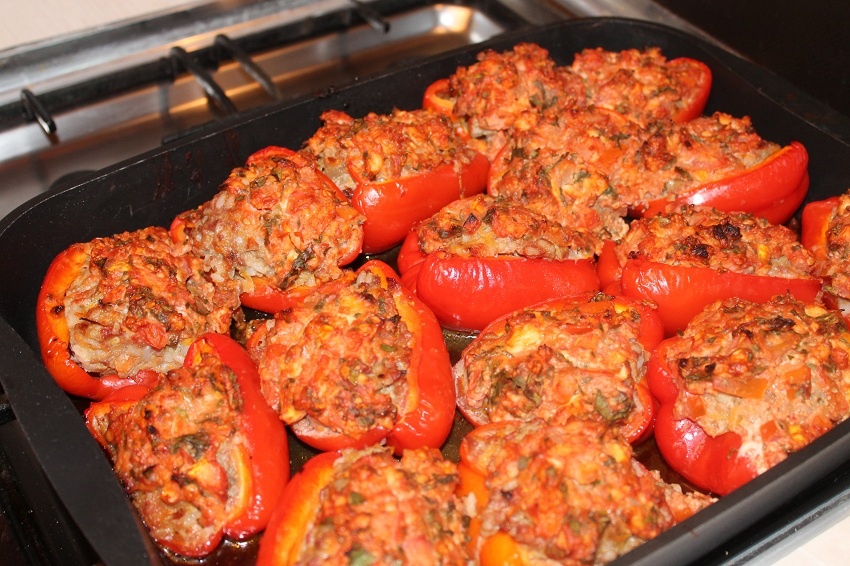 Перцы фаршированные под шубкой. Сварила немного риса. Вариант, как его сварить, по ссылке ниже Пока варится рис, перцы порезала пополам, очистила их от семян. Подготовила овощи для фарша и шубки. Фарш обычный как любите, у меня так: мясной фарш (я люблю смесь свиного и говяжьего), вареный рис, луковица+морковка (слегка поджарить), можно яблоко, кабачок, посолить, поперчить. Шубка: 2 помидора, можно баночку консервированных в собственном соку (лучше резанные), зелень, чеснок, сыр - твердый сыр, натертый на терке, еще лучше сулугуни, на крайний случай можно плавленный, майонез, можно добавить томатную пасту. Для фарша поджарила лук. Добавила с нему натертые на терке морковь и яблоко. Притушила слегка, посолила, поперчила. Тут рис сварился. Фарш посолила, поперчила. Добавила к нему рис и поджарку (пусть остынет слегка, а пока делаю шубку) Для шубки смешала порезанный помидор с зеленью, чесноком, томатной пастой и сыром. Размешала фарш, начинила перцы. Сверху выложила шубку, он