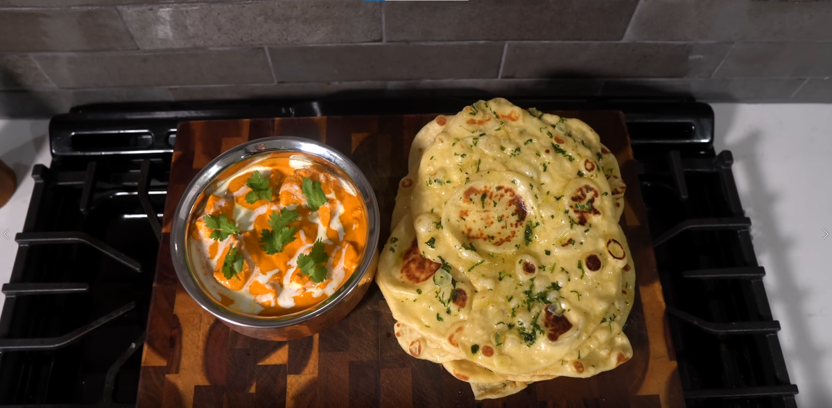 Рецепт курицы в сливочном масле: 1-й маринад для курицы в сливочном масле: от 1,5 до 2 фунтов куриной грудки 2 ст.л. Свежеотжатого лимонного сока 3 ч.л. кашмирского порошка чили 1 ч.л. кошерной соли 2-й маринад для курицы в сливочном масле: 1/3 стакана греческого йогурта 2 ст.л. масла авокадо 1 ч.л. молотого пажитника (желательно с листьями) 2 ч.л. порошка куркумы 3 ст.л. измельченного чеснока 1 ст.л. измельченного имбиря 2 ч.л. гарам масала Чесночный наан: 2 ч.л. активных сухих дрожжей 1 ч.л. сахара 1/2 стакана теплой воды 1 большое яйцо 1/3 стакана масла авокадо 1/4 стакана простого йогурта 2 1/3 стакана муки грубого помола 1 ч.л. соли Чесночное масло: 1 ст.л. несоленого сливочного масла 5 измельченных зубчиков чеснока 3/4 стакана измельченной кинзы 1/2 ч.л. соли Сливочный соус для курицы: Сверху - жареная курица 24 унции помидоров на выбор 1 палочка корицы 1 зеленый перец чили 6 стручков кардамона 3 маленьких кусочка гвоздики 3 ст.л. несоленого сливочного масла (для соуса) 2 ст.л. н