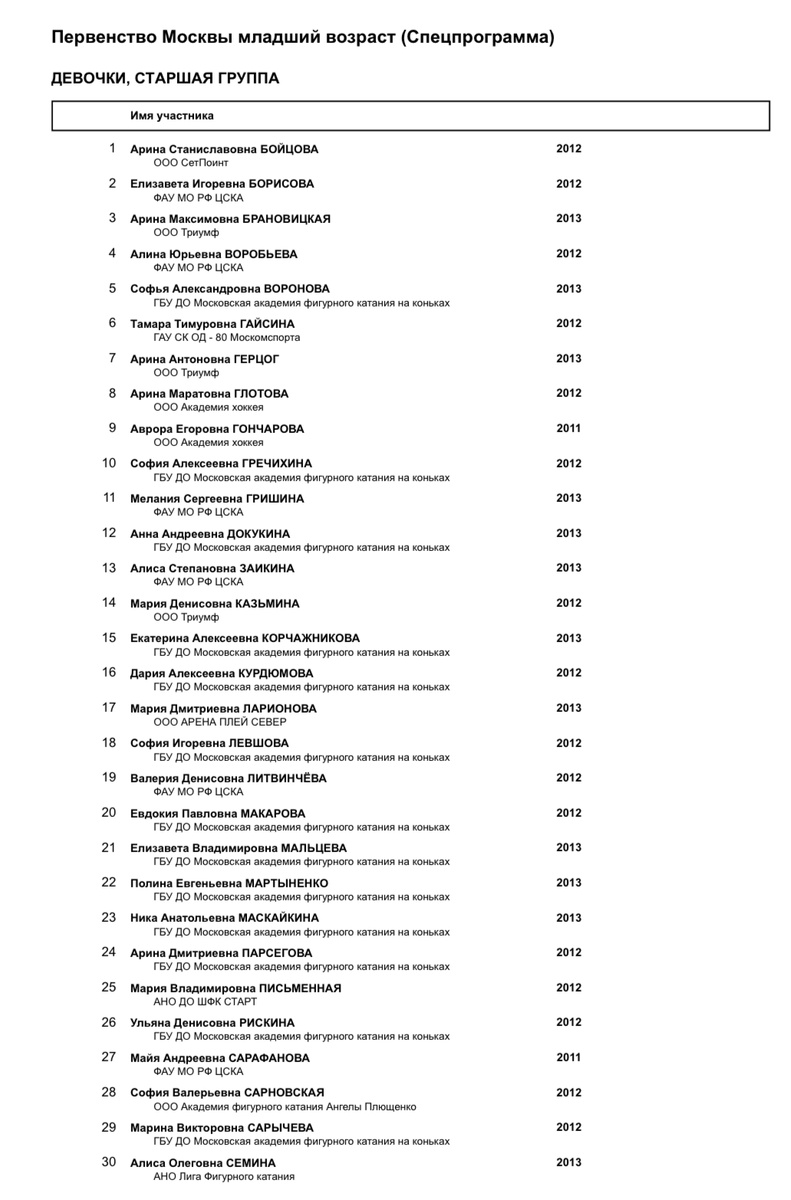 С 14 по 18 января в Москве на ледовой арене «Мечта» пройдёт Первенство Москвы по младшему возрасту. Это очень серьезный турнир для юных фигуристов, который является отборочным соревнованием на «Мемориал С.А. Жука». «Мемориал С.А. Жука» является «детским» Первенством России. И поехать на него от Москвы смогут 6 лучших спортсменов по итогам данных соревнований. Соревнования проходят в одиночном катании. Есть 2 возрастные группы — младшая и старшая. Младшая группа это спортсмены 2014 года рождения и младше. Старшая 2011-2013 год. Здесь троеборье: короткая программа, элементы (прыжок, каскад, дорожка шагов и вращение) и произвольная программа). После короткой программы останется 24 сильнейших спортсмена (это касается девочек, где заявок очень-очень много) Начнем со старшей группы, так как там много знакомых имен. Девочки 👆Листайте карусель, там 2 страницы. Состав просто невероятный! Лучшие спортсменки в своем возрасте. Анна Докукина, Алиса Заикина, Екатерина Корчажникова, Валерия Литвин