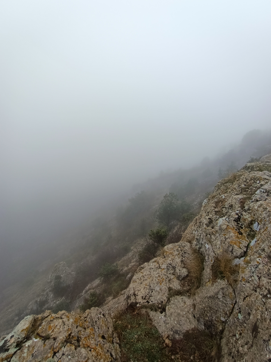 Раннее утро, солнышко светит сквозь облака, не согревая покрытую обильной росой землю, заморосил мелкий противный дождик, который по прогнозу погоды должен через час закончиться. Поверив прогнозу, поехал в горы... Сегодня прогулка по Малташской тропе вдоль реки Арманка к перевалу Шайтан-Мердвен. Это пятая дорога, которая ведёт к перевалу и единственная, по которой ещё не ходил. На подъезде к Севастополю появился туман, сначала небольшой, а потом, чем выше, тем туман становился гуще... Но ехать обратно было поздно. "Ёжик" решил идти в туман. Тем более, что навигатор работал, а тропа была промаркирована. Всё может поменяться в секунды, но после четырёх подъёмов к Шайтан-Мердвену уже не так страшно. Там наверху всегда можно найти Мордвиновскую дорогу, по которой уже не заблудиться. В лесу тумана не было, как будто его не существовало, но вот когда вышел на отмеченную смотровую площадку, то увидел... Ничего я не увидел. Внизу, там, где должна была течь река, где она шумела по камням, ничег