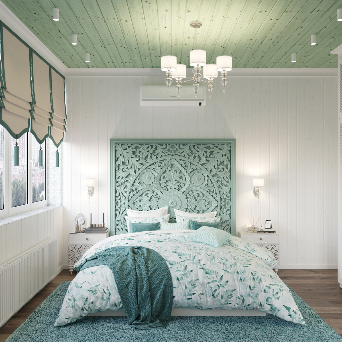 В комнате откосы и подоконники выложены из плитки ручной работы спокойного зелёного оттенка, таким образом интерьер становится ещё более индивидуальным и необычным.