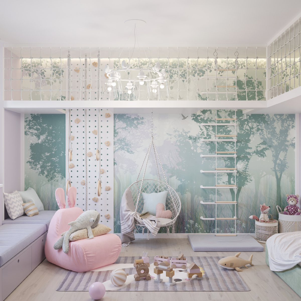 Данное пространство получилось многофункциональным. Здесь ребёнок может и рисовать на графитовой стене, и лазить по лесенкам и скалодрому. Также продумано рабочее место, где есть полки для книг и Весь спектр полноценного развития. Предусмотрено хранение вещей и игрушек. Есть мягкое сиденье с ящиками, а также подвесное кресло, где можно отдохнуть от игр. На верхнем ярусе можно и поиграть с игрушками, и полежать.