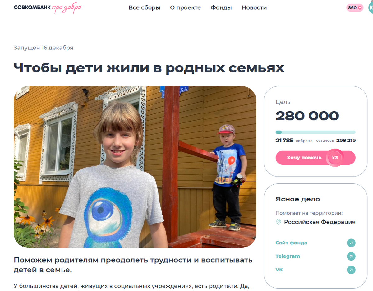 Благотворительный фонд "Ясное дело" теперь представлен на платформе "Совкомбанк про добро". Благодаря нашему партнёру помогать детям и взрослым, попавшим в беду, стало ещё проще.