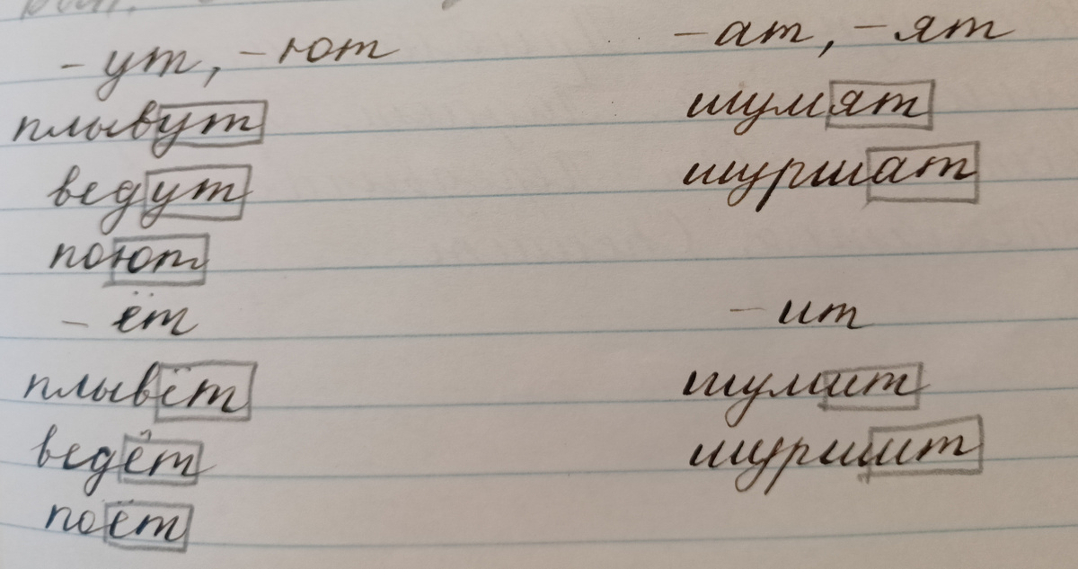 1. Проверка домашнего задания. 2. Актуализация знаний и объявление темы урока. - Чем отличаются по значению имена существительные, имена прилагательные и глаголы? (Обозначают предмет, признак и действие). - Как изменяются имена существительные? (По числам, по падежам. По родам не изменяются) - Как изменяются имена прилагательные? ( По числам, падежам и родам). - Как изменяются глаголы? ( По лицам, числам и временам). - Назовите местоимения 1 лица; 2 лица; 3 лица. - Какие окончания имеют глаголы 2 лица единственного числа? 3 лица единственного числа? Сегодня мы будем учиться писать окончания глаголов 3 лица множественного числа. 3. Работа по теме урока. Откройте учебник на стр. 74. Прочитайте стихотворения. Выпишем глаголы в два столбика: в первый - с окончаниями -ут, -ют, во второй - с окончаниями -ат, -ят. Какое местоимение подходит к эти глаголам? (Местоимение 3 лица множественного числа ОНИ). Изменим эти глаголы в единственное число. Напишем под ними. К какому спряжению относятся гл