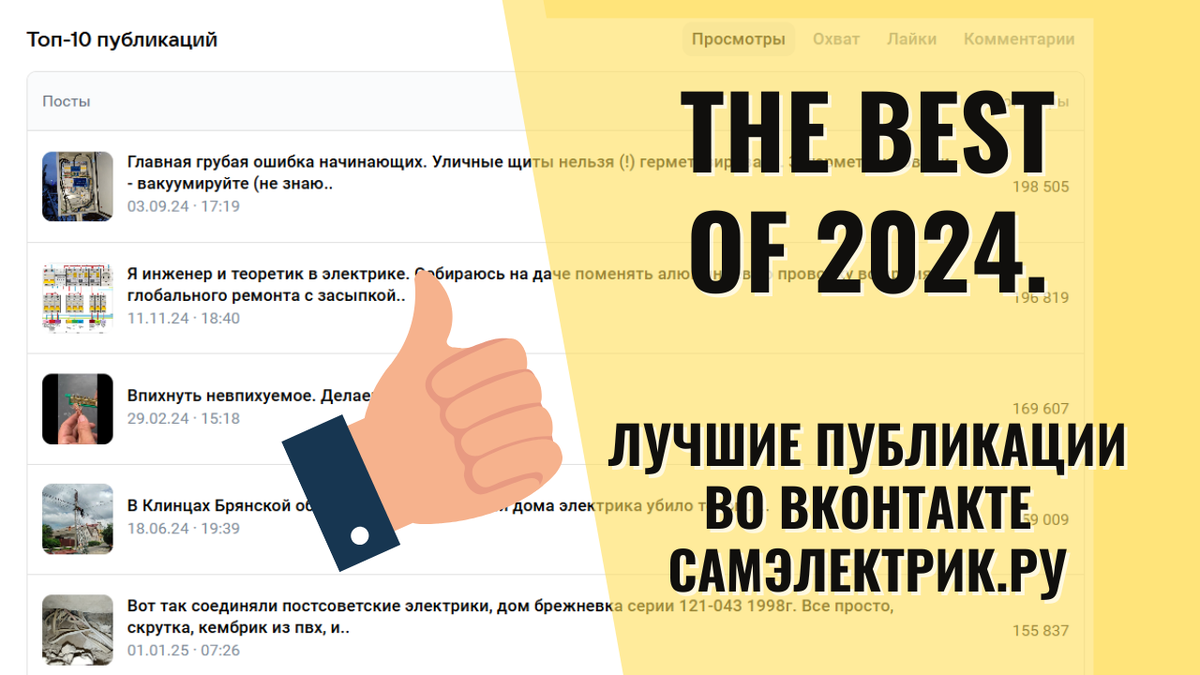 После того, как мы посмотрели, что самого интересного было в 2024 году в Дзене, самое время посмотреть, чем больше всего увлеклись читатели ВК. Как всегда, рейтинг непредсказуем - казалось бы, совсем непримечательные темы привлекли читателей так, что становится интересно, что же в них (публикациях) такого особенного? Итак, начинаем с конца, по количеству просмотров. 5. 155 тыс.просмотров. Вот так соединяли постсоветские электрики, дом брежневка. Все просто, скрутка, кембрик из пвх, и для очистки совести СИЗ. А вы говорите СИЗ плохие, да вот, уже скока лет да работает исправно. 4. 159 тыс. В Клинцах Брянской области при подключении дома электрика убило током. Трагическая история и фото про смерть на работе. 18+ 3. 169 тыс. Впихнуть невпихуемое. Делаем правильно. Как подсоединить многожильный провод (сорян, многопроволочную жилу)) к винтовой шине. 2. 196 тыс. Я инженер и теоретик в электрике. Собираюсь на даче поменять алюминиевую проводку.... Пожалуй, самый популярный жанр в ВК - критик