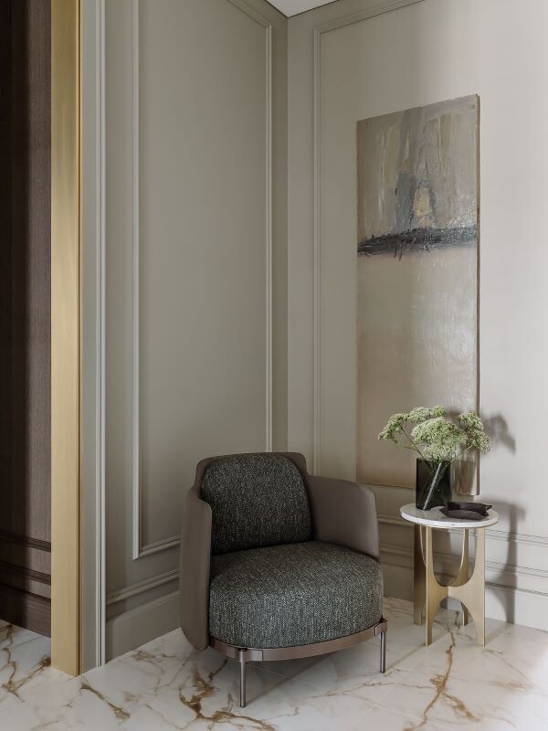 Серый цвет в таких интерьерах очень разный. Ощущения стиля и элегантности можно добиться, если использовать разные оттенки серого цвета. Посмотрите на фотографию этого интерьера: сколько оттенков серого вы видите? Считаем? Оттенок стен, цвета картины, цвет обивки кресла, серые прожилки на мраморном полу. Черный и белый - как акценты в декоре.