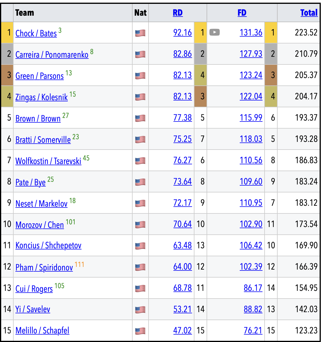 Обратите внимание на маленькие цифры у фамилий спортсменов в таблицах - это их место в мировом рейтинге ISU на текущий момент.
