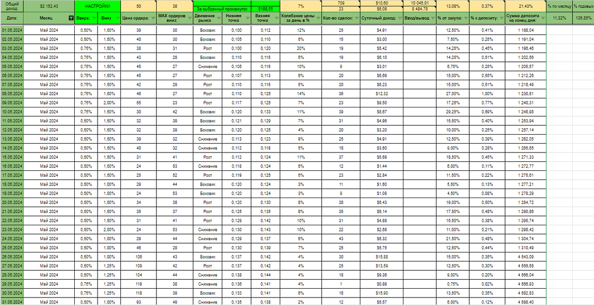 Создание торгового бота — это не просто технический процесс, но и целая история экспериментов, тестирования и улучшений. В этой статье я хочу поделиться с вами результатами работы моего бота с самого начала его разработки, начиная с мая 2024 года, ещё до того, как он стал доступен широкой аудитории. Изначально бот был лишь концепцией, которую я тестировал на реальном рынке. С первых дней его работы я сосредоточился на минимизации рисков и создании простой, но эффективной стратегии: Доходность: 11,32% к депозиту за май или 135,85% годовых без учета сложного процента (реинвеста).) Несмотря на то, что это был лишь старт, результаты оказались завораживающими. Бот не только справился с поставленной задачей, но и продемонстрировал впечатляющую доходность в 11,32% к депозиту всего за месяц. Это дало мне уверенность, что разработанный алгоритм имеет огромный потенциал и способен стабильно работать даже на начальных этапах тестирования. В июне я сосредоточился на разработке новых функций, напр