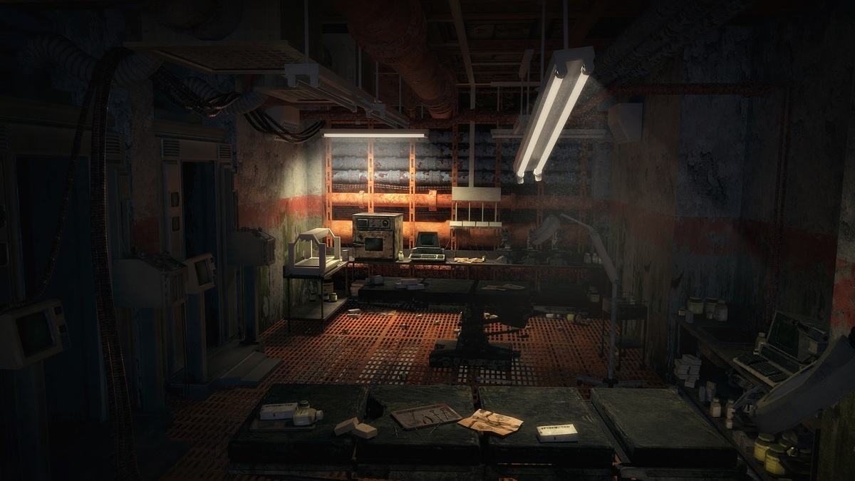 Спецназовец добрёл до разрушенного мостика. Осмотрев место, он принялся карабкаться по стене на ту сторону, так как он не знал больше пути. Его раненая рука начинала ныть и... разбухать. Кое-как преодолев расщелину, боец вошёл в душевую, в которой по прежнему лежали скелеты, откуда-то лилась вода из лейки. Выйдя из помещения он обнаружил раскопанный лаз до исследовательской части.