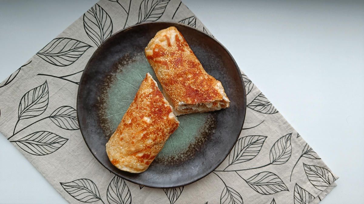 Сегодня с вами поделюсь необычным омлетом - с кунжутом. Некоторое время назад в соцсетях постоянно мелькал такой вариант яичного блинчика или ролла. К сожалению, я не запомнила автора этой идеи. Но в памяти это блюдо отложилось. Кроме того, у нас дома осталось совсем немного запечённой куриной грудки - на одну маленькую порцию, поэтому я думала, каким образом увеличить количества белка на двоих. По итогу у нас получился ультрабелковый обед😁 Итак, яично-кунжутный ролл с сыром и белковой начинкой: Ингредиенты: Количество ингредиентов на 1 порцию: ~КБЖУ 1 блинчика без начинки: 414/16/19/1,7 1. Две ложки кунжута высыпать на сухую сковороду. Помешивать несколько минут. Диаметр моей сковороды - 18 см. 2. Сыр потереть на крупной тёрке. Когда кунжут начнёт румяниться, сверху посыпать его сыром. 3. Яйца немного взбить в миске и залить ими кунжутно-сырную смесь. Яйца можно немного посолить. Всё зависит от того, насколько солёный ваш сыр. У меня, кстати, был чеддер. 4. Готовить пару минут под к