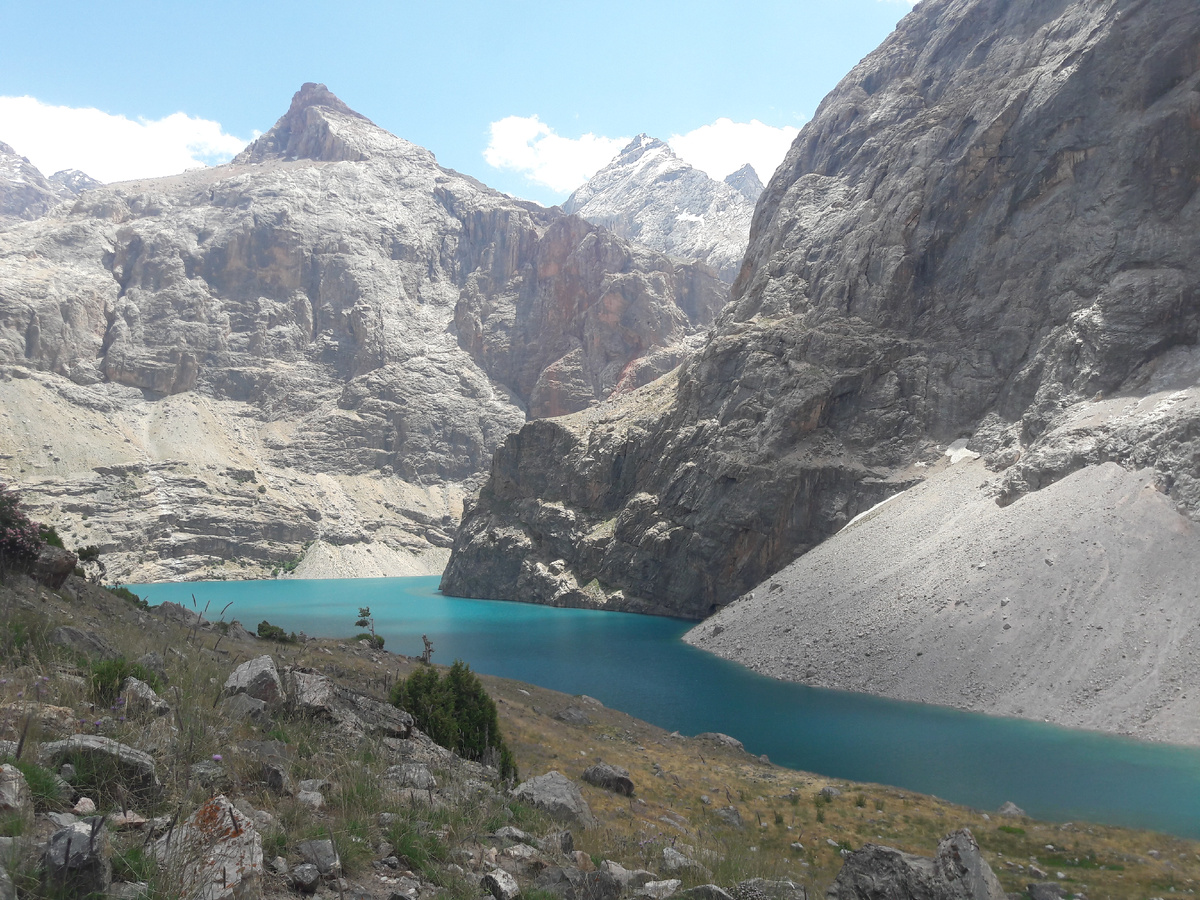 28 июля 2019 года (Фанские горы, день девятый) Наше горное путешествие близится к завершению. После отлично проведенного времени на озере Большое Алло, нам пора идти дальше. Впереди долгий переход на 12 км, спускаемся вниз. Мы позавтракали кукурузой с тушенкой, собрали рюкзаки и двинулись в путь, окинув взором это райское озеро. Начало пути оказалось непростым. Полтора часа мы только обходили озеро, пытаясь выбраться. Попали на сложный участок, кругом были сплошные камни. Мы немного сбились с пути и попали на сыпуху. Было страшно. Камни так и сыпались из под ног, а наклон был довольно крут. Антон спустился, а мы с Машей застряли. Антон сказал скидывать рюкзаки вниз по камням, чтобы было легче идти. Я побоялась скидывать рюкзак, вдруг оторвутся лямки или сломаются застежки. Кое-как, контролируя каждый шажок, мы прошли эти камни. Позже Антон меня отругал за то, что я не послушалась на сложном участке, нарушила технику безопасности и не скинула рюкзак. К счастью, все обошлось, никто по сы