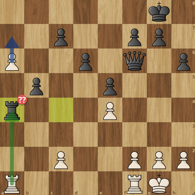 После этого белые играют - a7! После этого черные отвечают - Qd8, их задача не дать белым провести пешку в ферзи,
