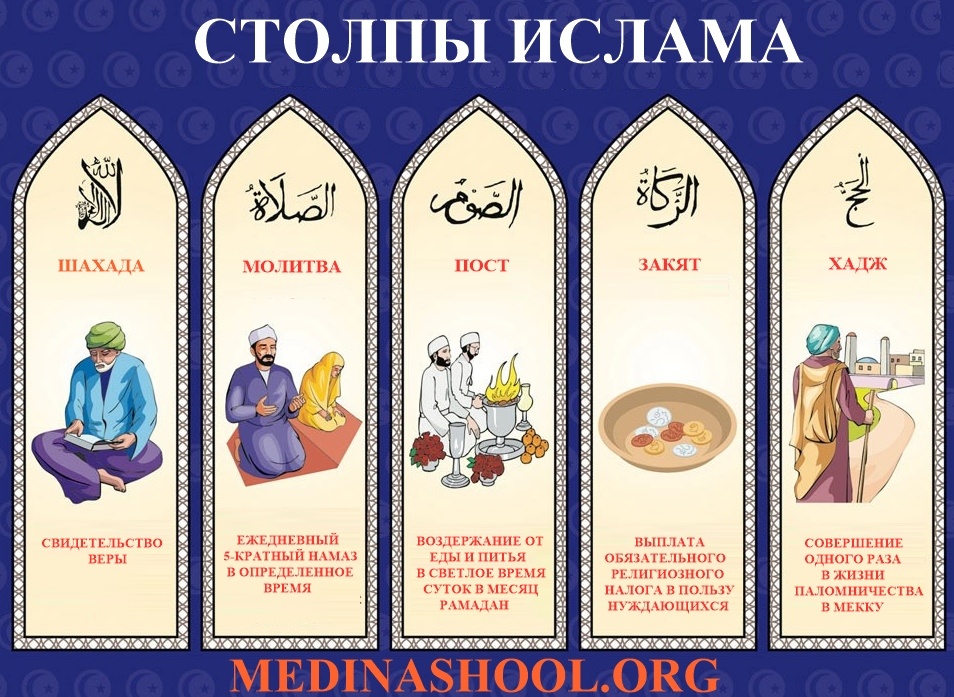 5 столпов ислама – предписания шариата, которые образуют основу ислама и является обязательной для всех мусульман. Пять столпов ислама включают в себя шахаду, намаз, уразу, закят и хадж.