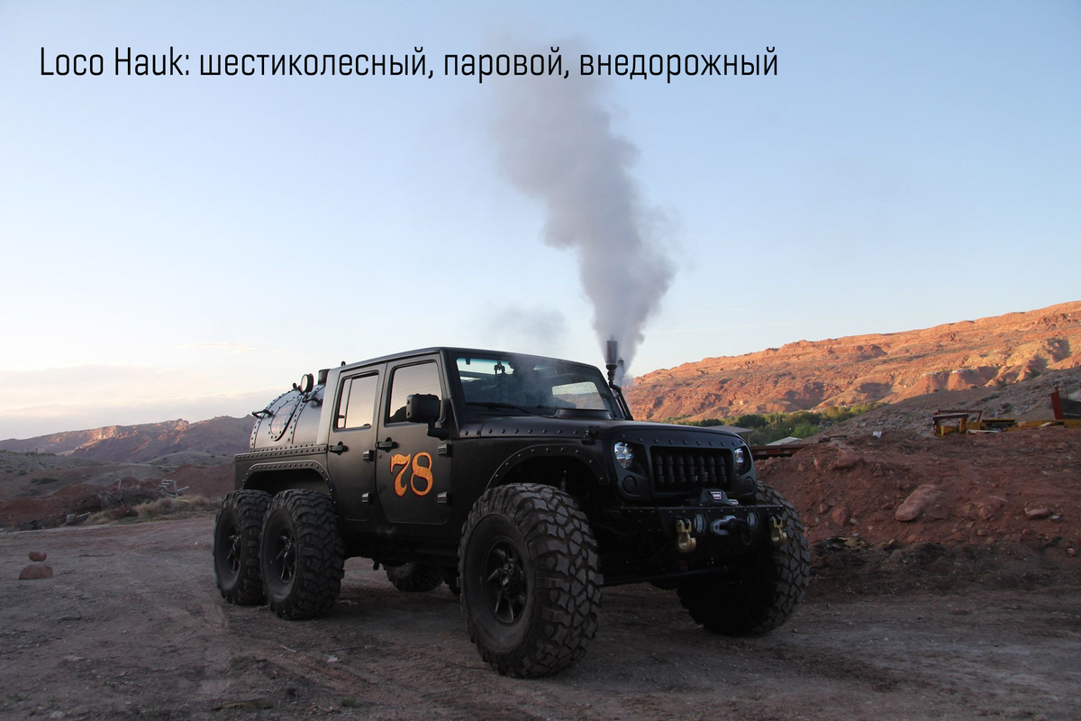 Творение Кенни Хока, владельца Hauk Designs и River Raider Off-Road из Пенсильвании – это нечто, что трудно описать словами. Его уникальный проект, названный Loco Hauk, представляет собой паровой внедорожник, напоминающий огромный локомотив, который весит шесть тонн. Но он создан не ради буксировки железнодорожных составов, а только для того, чтобы прокладывать себе путь в какой-то фантастической параллельной вселенной. Там, где дорог нет и в помине. Сложно представить, что основой для такого амбициозного «парового» проекта мог стать весьма заурядный Jeep Wrangler образца 2008 года. Однако создателям Loco Hauk кажется, что он вписался идеально. Получившийся монстр, со слов очевидцев, выглядит так, будто какой-то любитель техасского барбекю скрестил дымящуюся коптильню с внедорожником. Loco Hauk оснащён паровым двигателем объёмом 100 куб. дюймов. Если вдаваться в детали, это магистрально-поршневой прямоточный паровой двигатель V-4 одностороннего действия с тарельчатым клапаном. Подобный